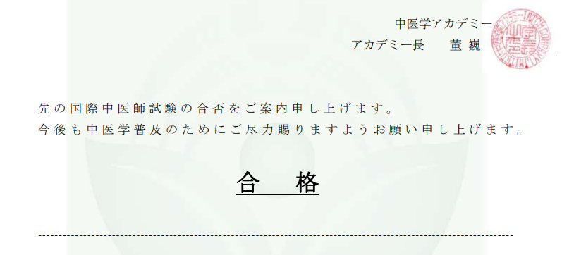 そして、今朝、国際中医師試験の合格通知を受け取りました!本当に嬉しかったです!!